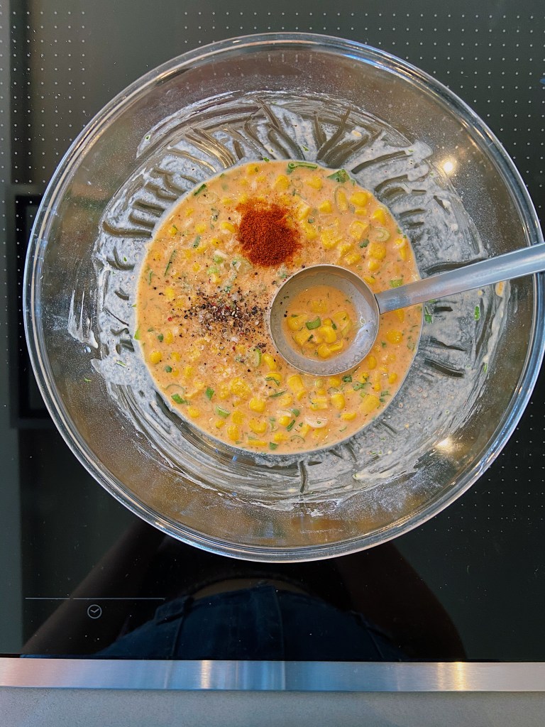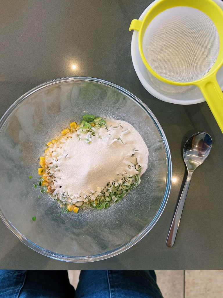 - Combine the sweetcorn, spring onion, coriander, self-raising flour, paprika, milk and egg in a bowl along with a generous pinch of salt and pepper to season.