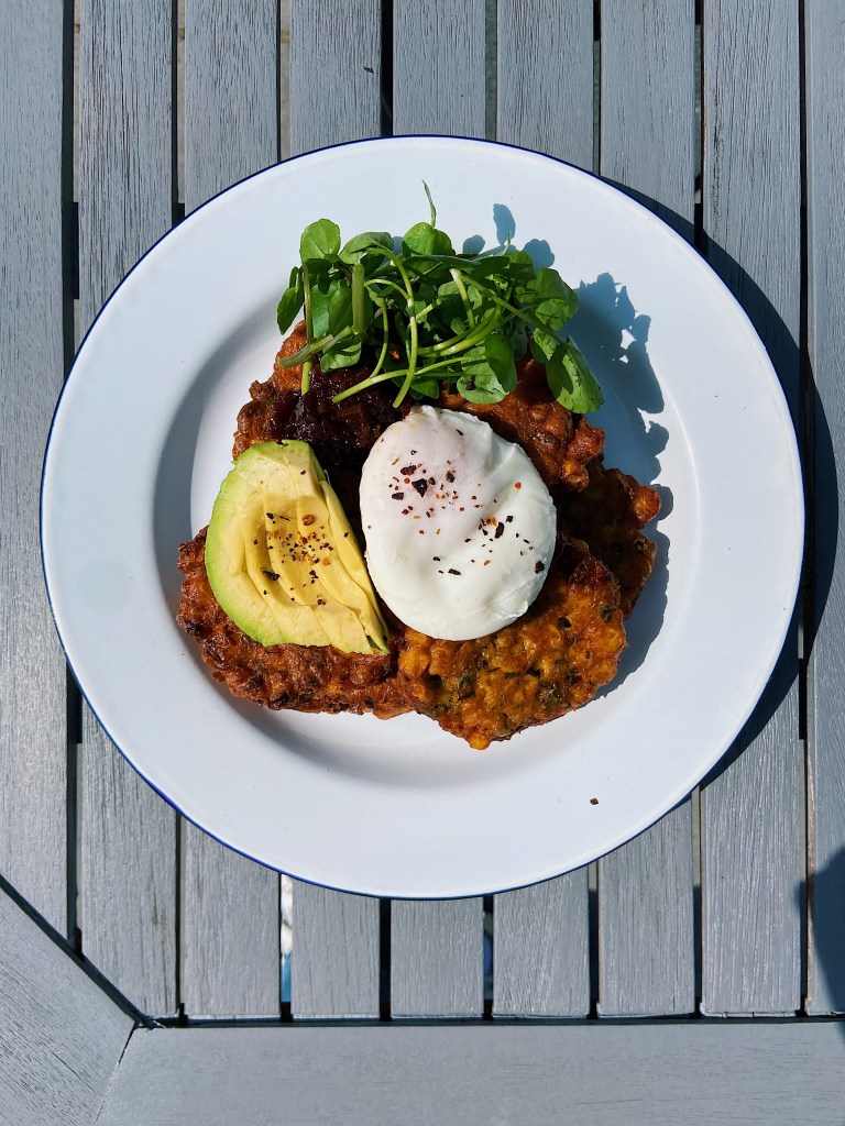If you’re hungover and in need of a quick late morning foodie fix or are itching to enjoy the last sunny Sunday mornings we’ll see for a while with an al fresco breakfast feast then give these bad boys a try. They are quick and easy to make with only a slight element of danger involved (shallow frying in hot fat so be careful). Tip: don’t make the fritters too big and make sure the oil isn’t too hot as you want them to cook all the way through and not burn on the outside.