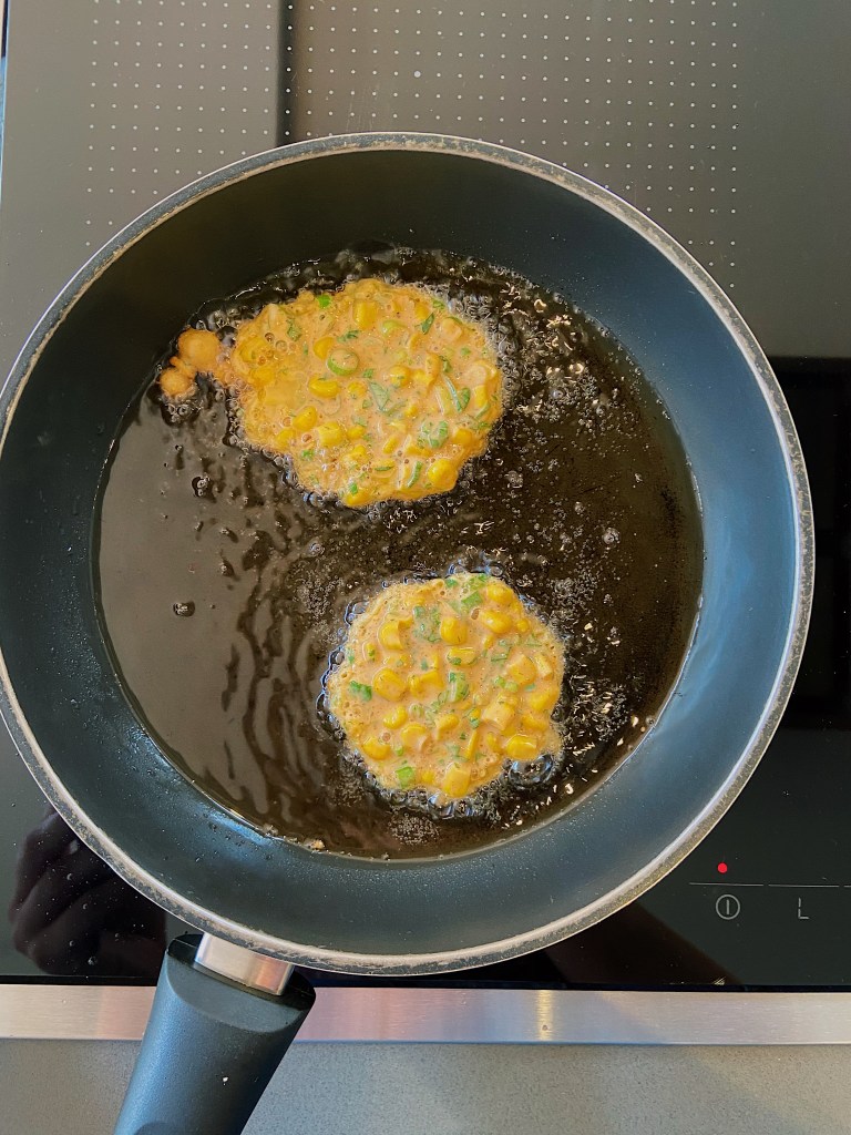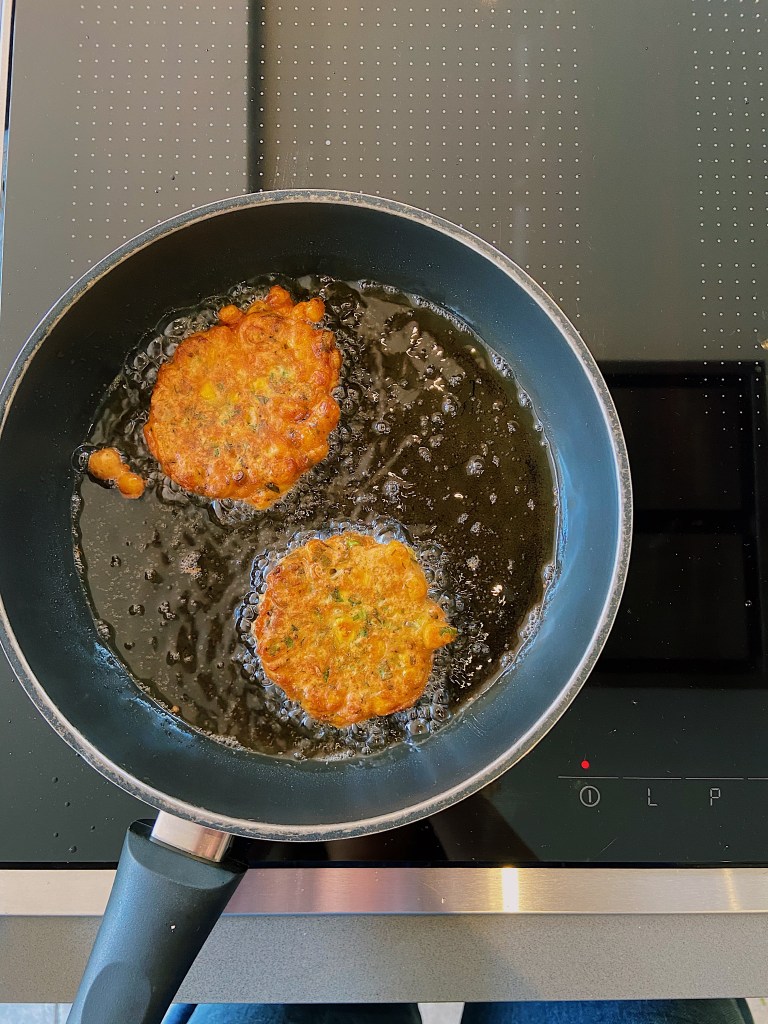 - Spoon a couple of small ladles of the batter into the pan at a time to make sure the fritters don’t merge. Cook until brown on one side and then flip and cook for a further 3 minutes. Remove and drain on a plate with some kitchen paper. Repeat with the remaining batter.